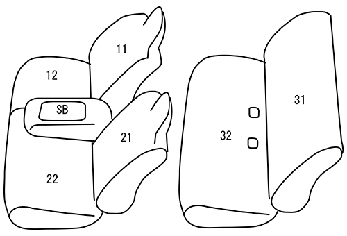 | 適合形状 | 1列目:座面形状が4:6分割、ヘッドレスト一体型、センターシート有り 2列目:背もたれ座面一体型、ヘッドレスト無し、シートベルト有り 3列目:背もたれ座面一体型、ヘッドレスト無し、シートベルト有り ※9人乗り仕様の1・2列目に適合 |