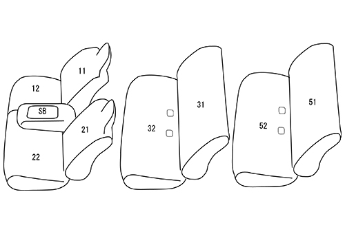 | 適合形状 | 1列目:座面形状が4:6分割、ヘッドレスト一体型、センターシート有り 2列目:背もたれ座面一体型、ヘッドレスト無し、シートベルト有り 3列目:背もたれ座面一体型、ヘッドレスト無し、シートベルト有り ※9人乗り仕様の1・2列目に適合 |