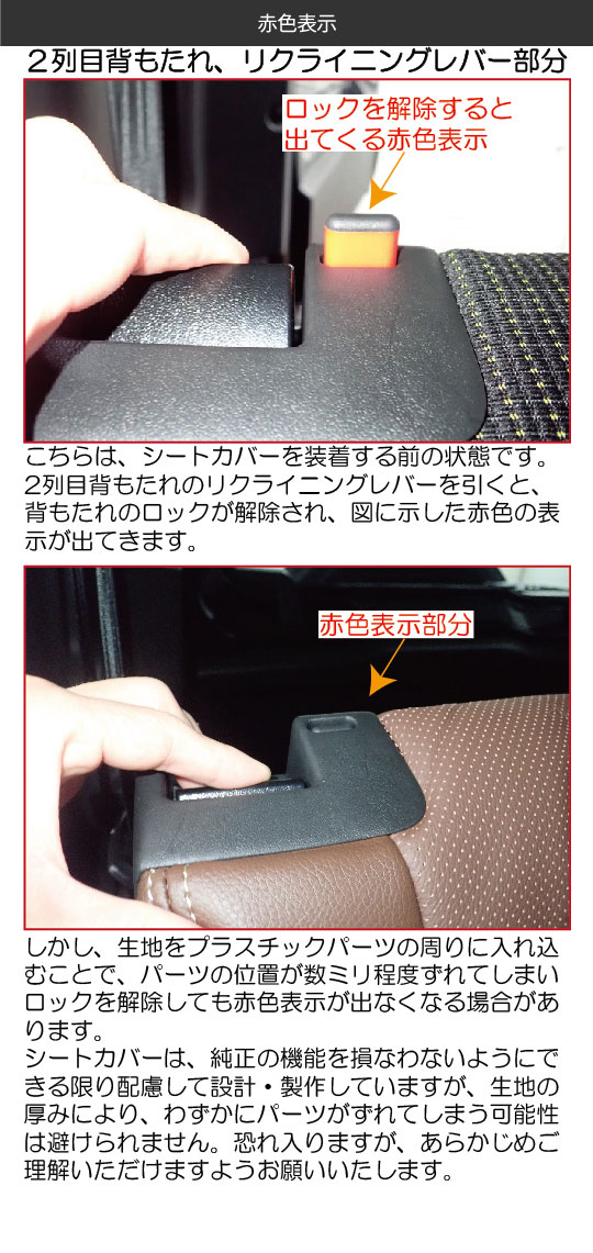 | 適合形状 | ※カバーの装着の仕方によっては、2列目背もたれのロック解除時に出る赤色表示が、 正常に出にくくなる場合がございます。 |